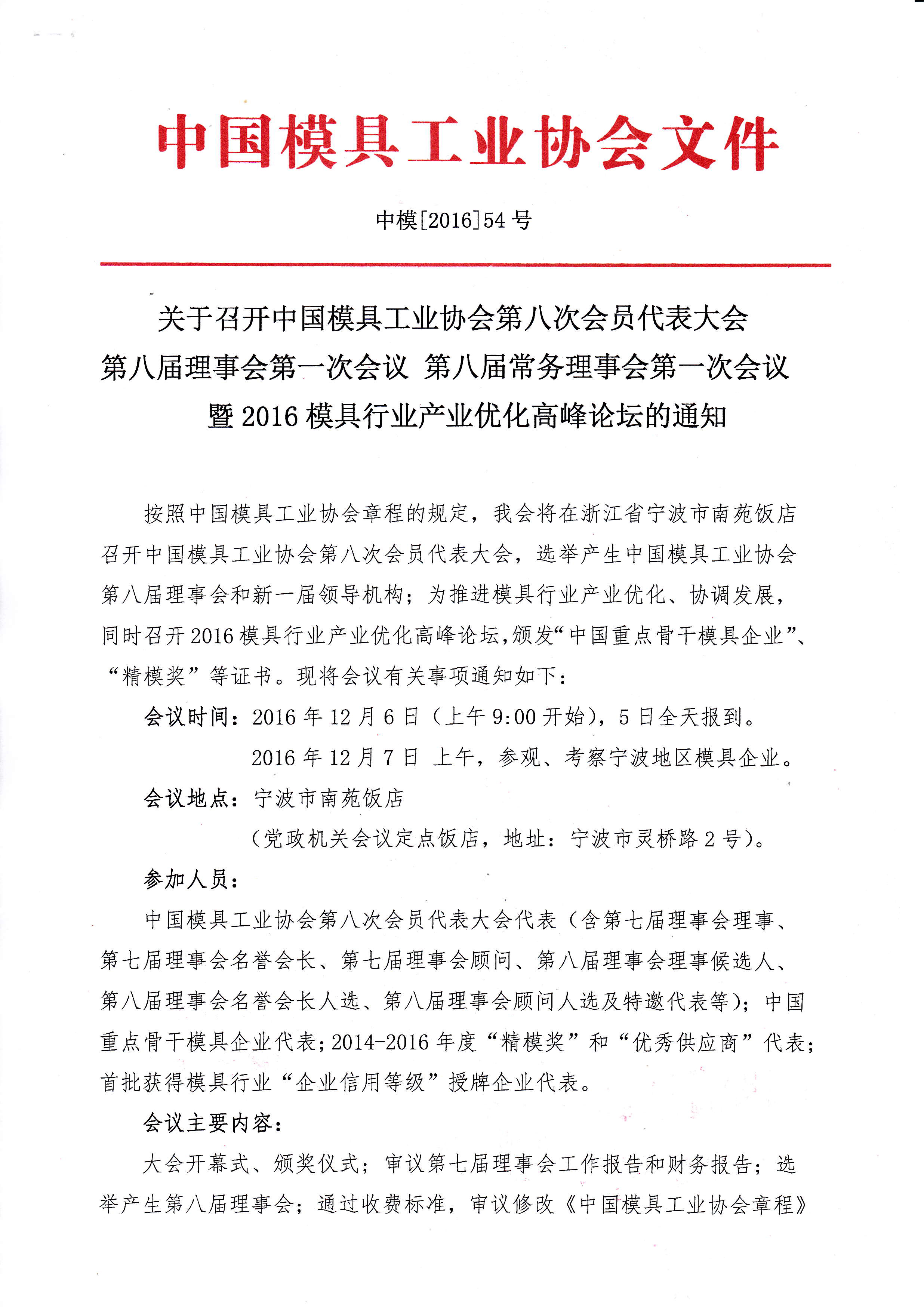 關于召開中國模具工業協會第八次會員代表大會第八屆理事會第一次會議 第八屆常務理事會第一次會議暨2016模具行業產業優化高峰論壇的通知 |