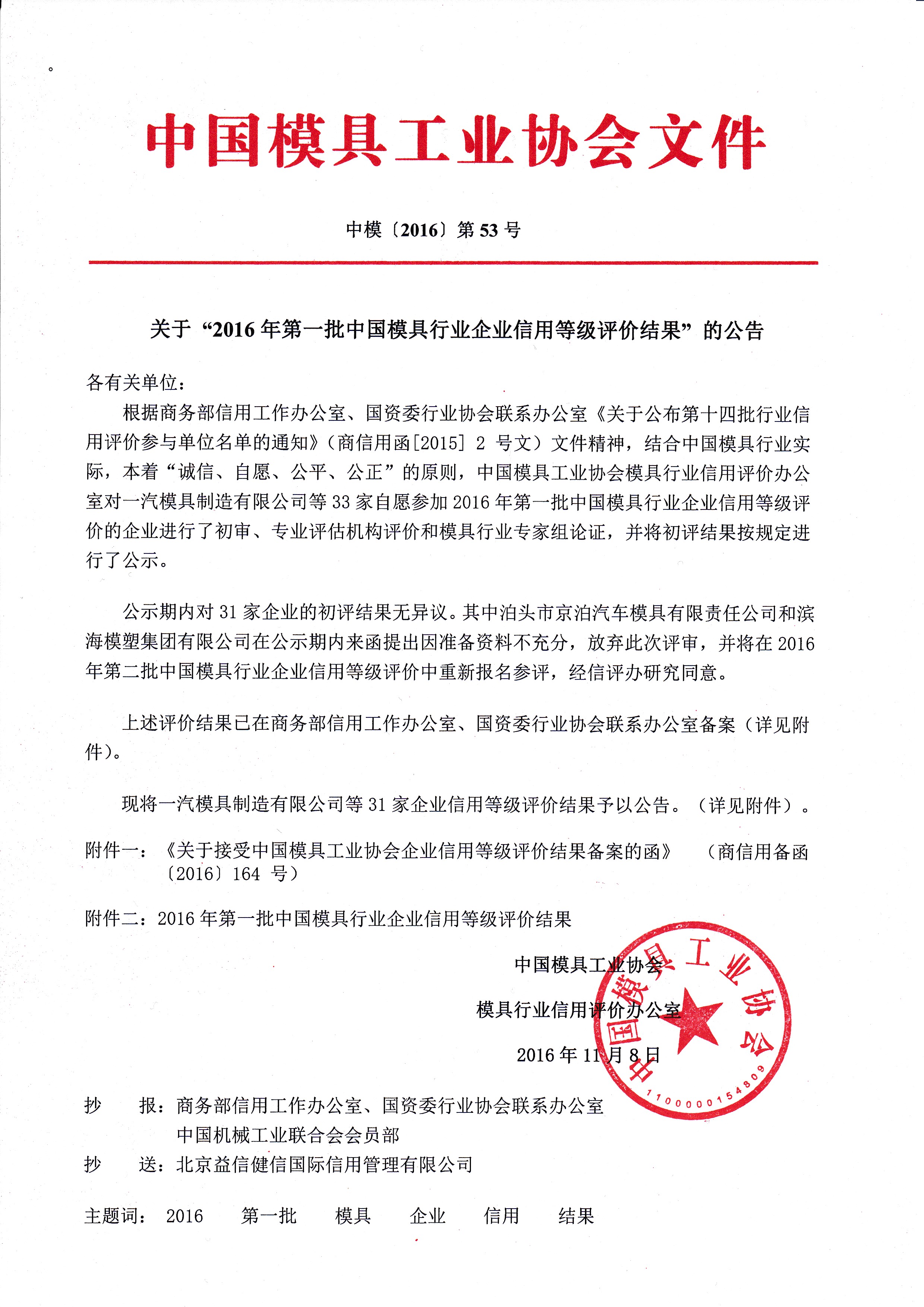 關于“2016年第一批中國模具行業企業信用等級評價結果”的公告