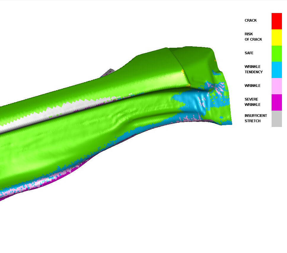 側圍外板的A柱上部都是優先考慮先切邊再側翻邊的工藝,在此工藝無法解決疊料的問題時才考慮使用先側翻邊再切邊的工藝。該側圍外板正是采用后一種工藝,即側圍外板在使用先切邊再側翻邊工藝造形疊料的情況下,改為先側翻邊再切邊的工藝,經過多次的CAE分析驗證最終得出了一種較好的方案(如圖8所示)。在拉延過程中盡量的少聚積材料,側翻邊時把多余的材料分散在一個較大的區域,達到消除疊料的效果,CAE分析結果如圖9。