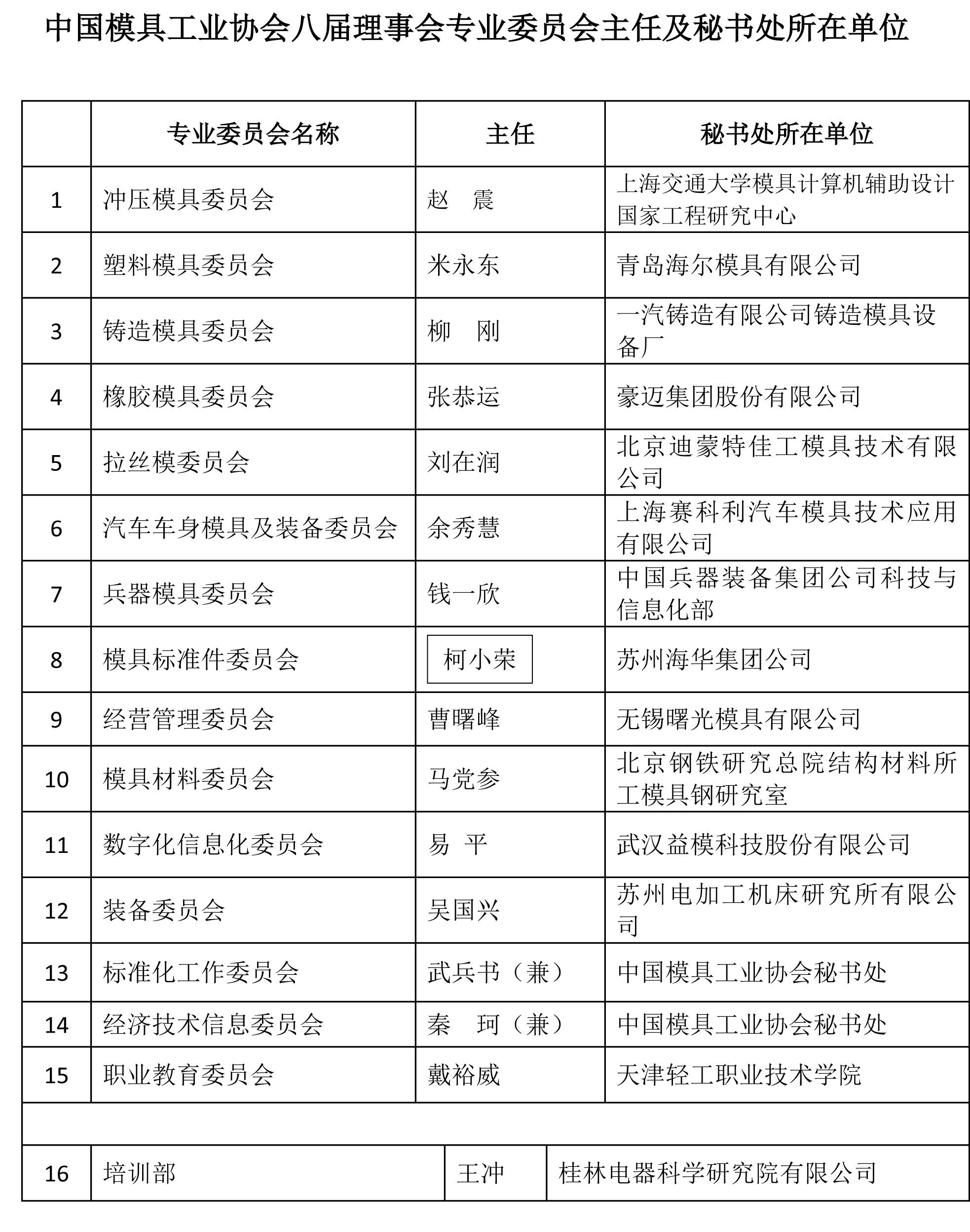 中國模具工業協會八屆理事會專業委員會主任及秘書處所在單位